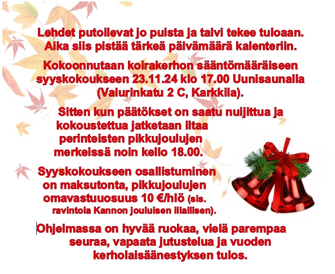 HUOM Jäsenten esittämät asiat syyskokouksen käsiteltäväksi pitäisi toimittaa kirjallisesti viimeistään 23.10.2024.